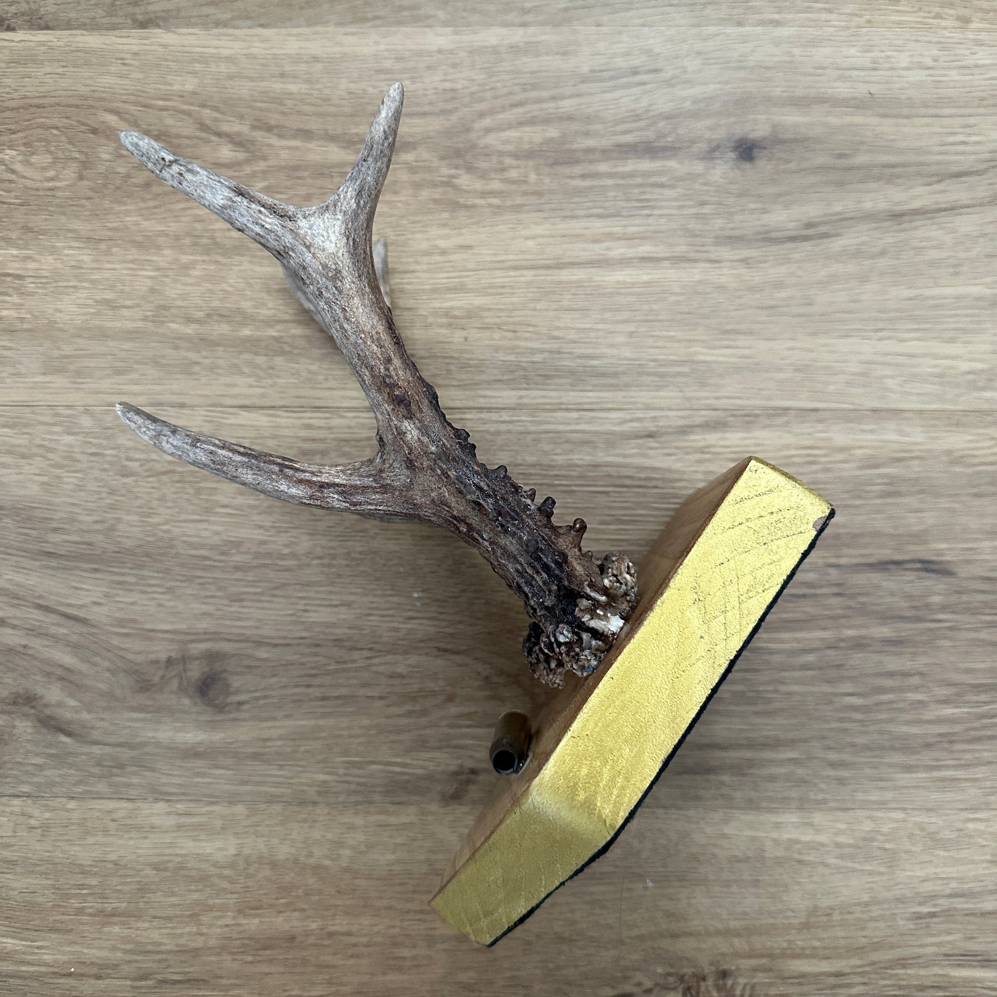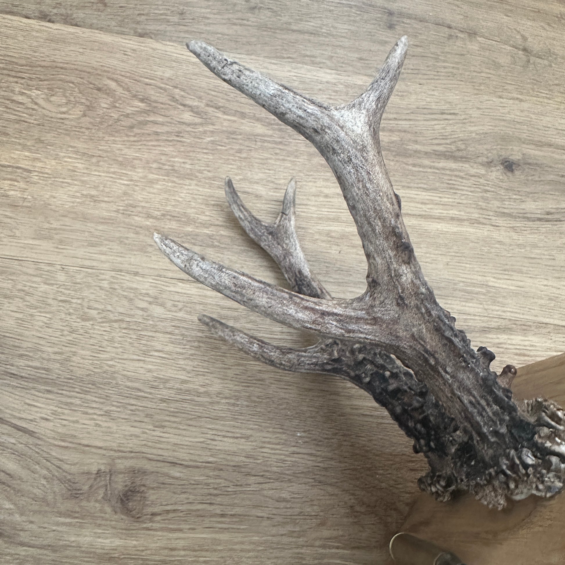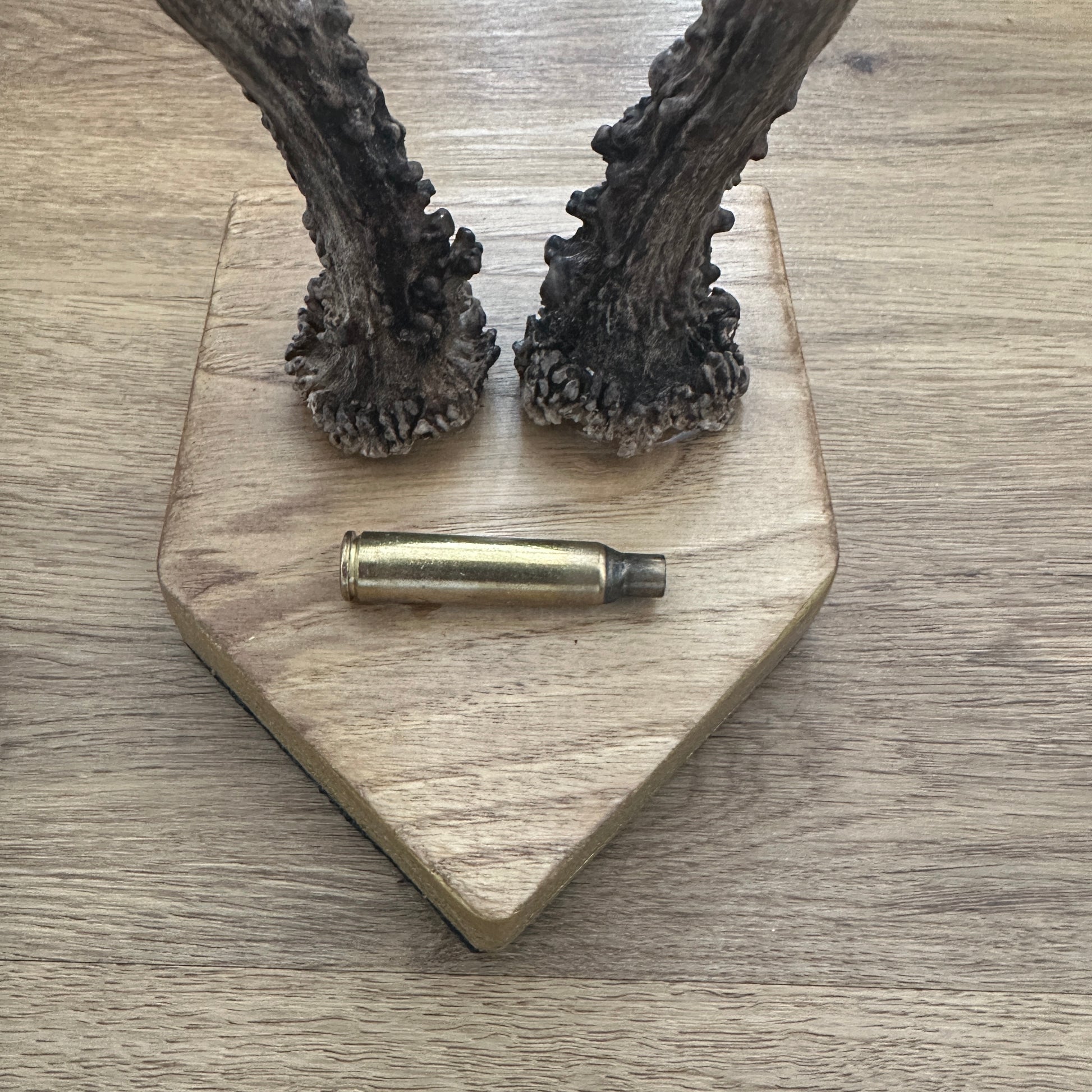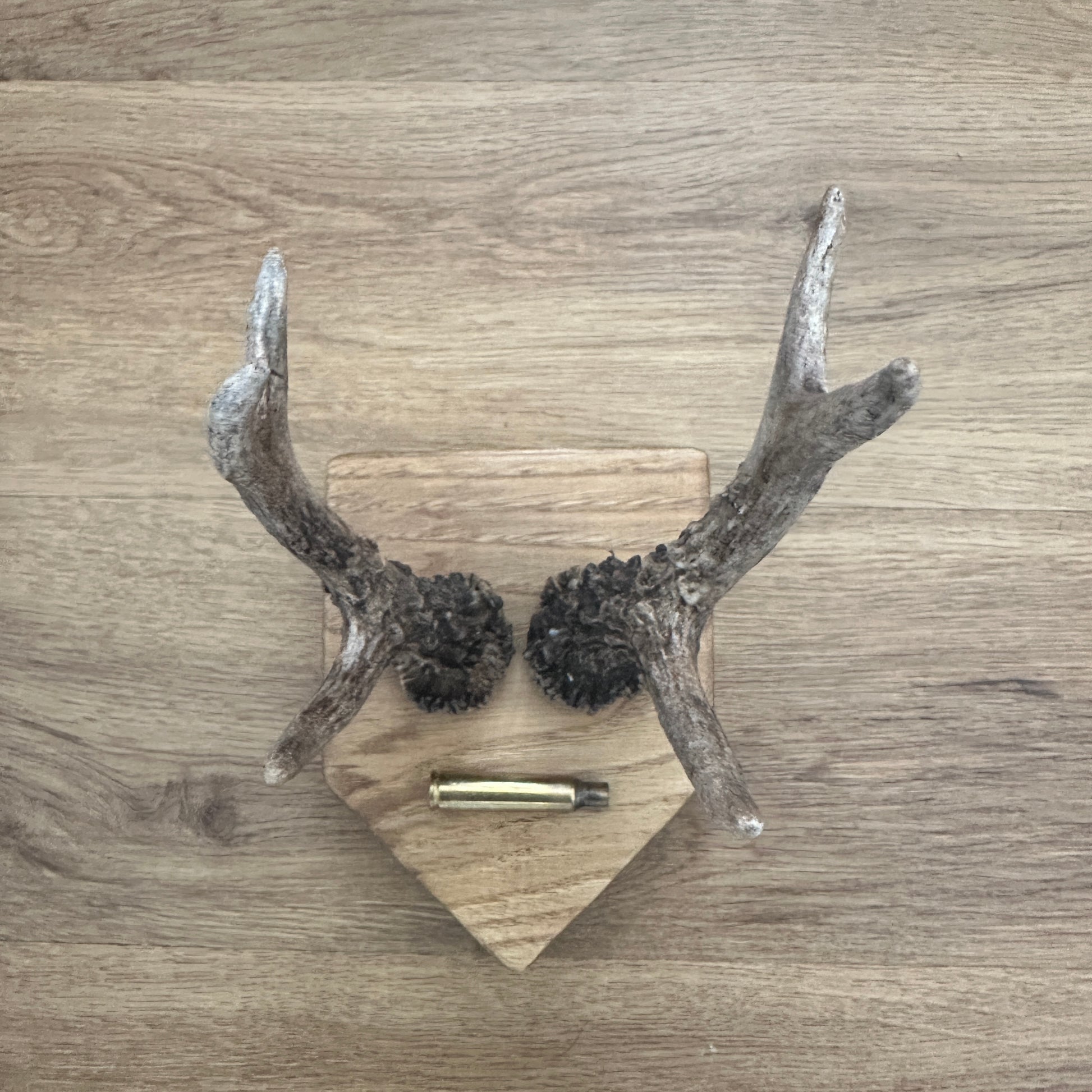 This 6 Point Sussex Roe Deer Antler is mounted on a oak plaque with a felt backing and features a 6.5 x 55 brass case. It showcases natural variations in size and shape typical of Roe Deer antlers. Ideal for collectors or as a decorative piece in any setting.