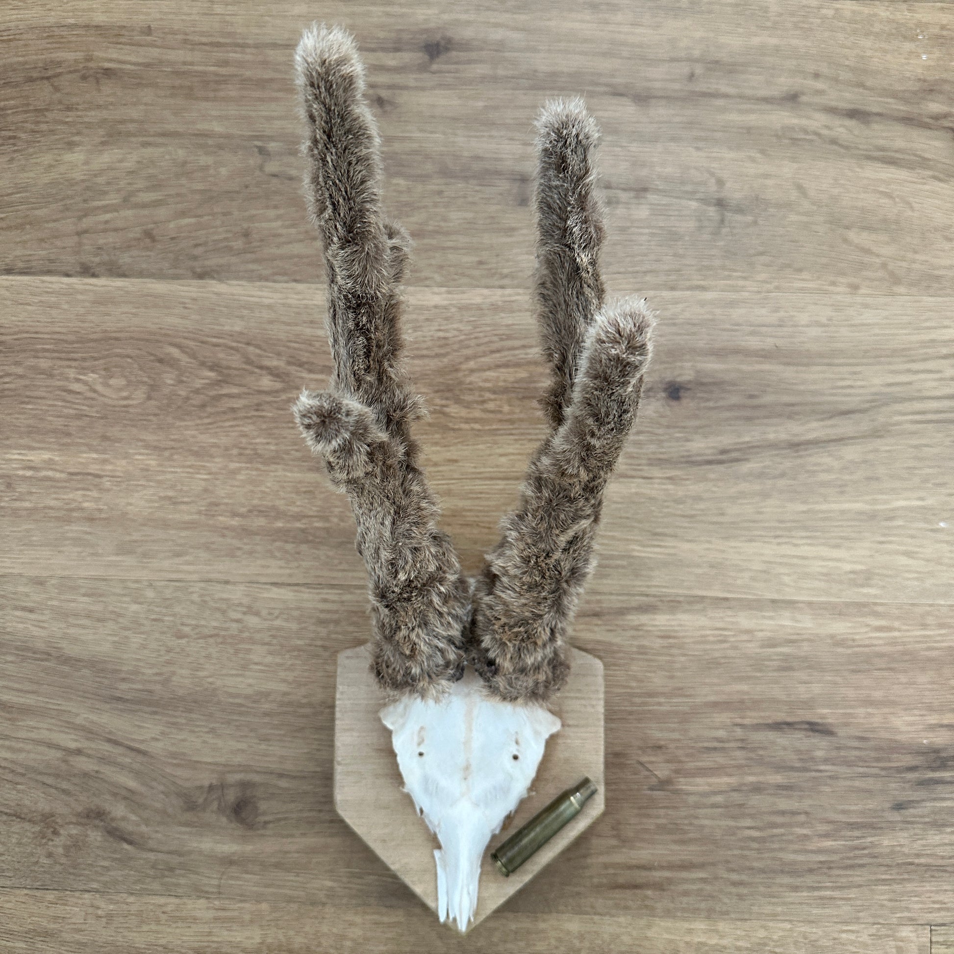 Large 6 Point Sussex Roe Deer Antler In Velvet Mounted on Oak Plaque