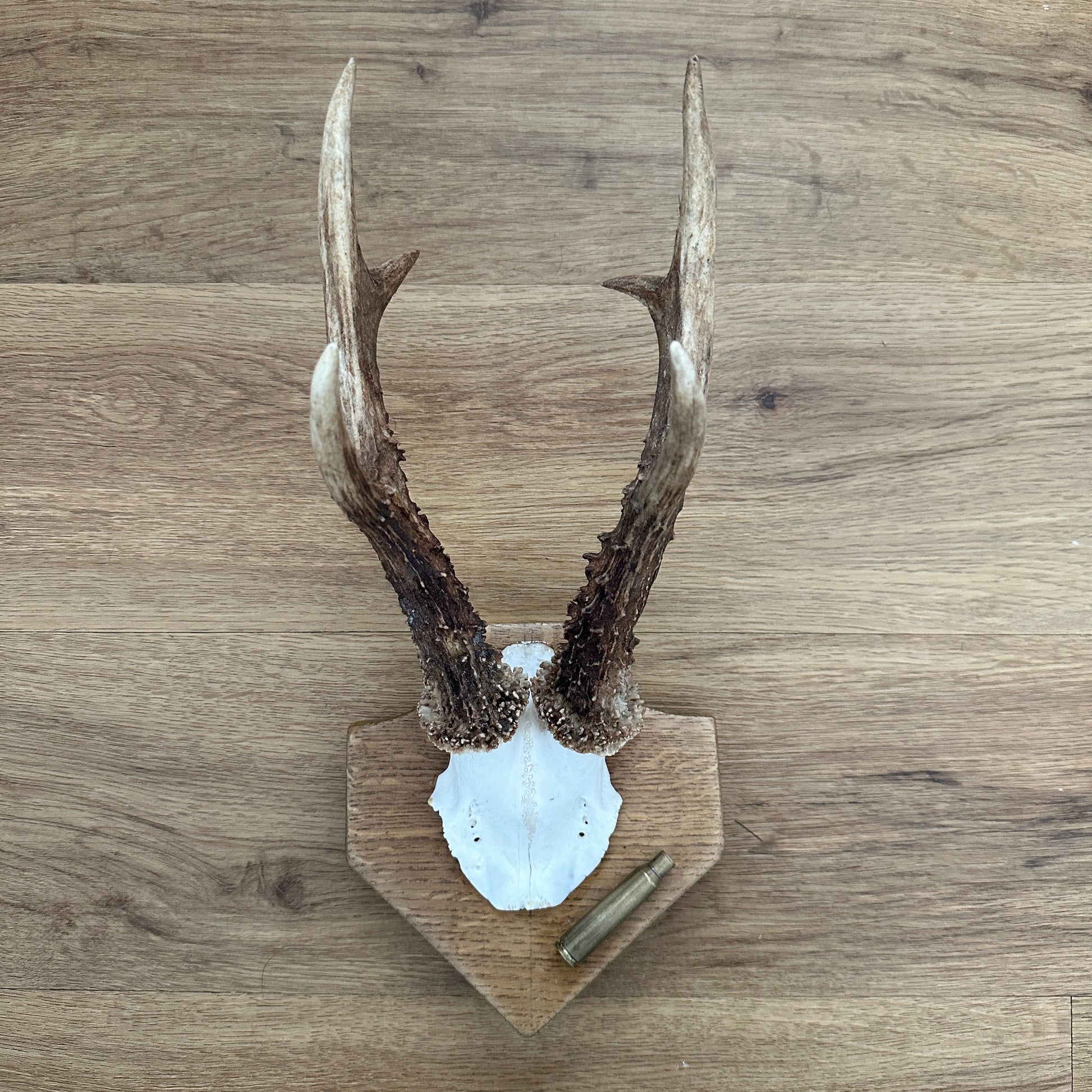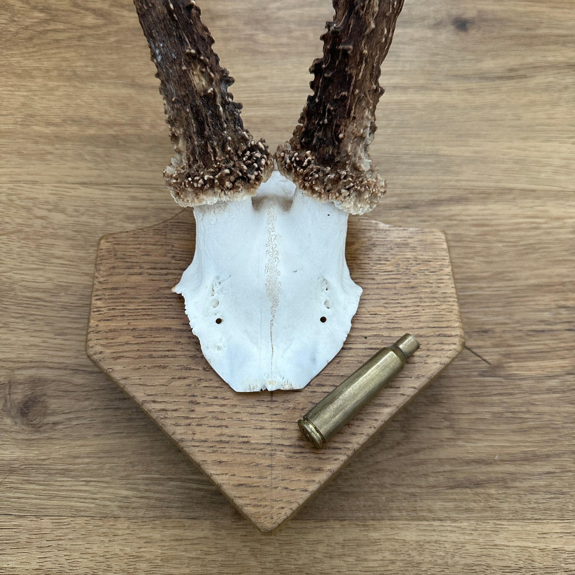 This Large 6 Point Sussex Roe Deer Antler is mounted on a oak plaque with a wall mount and features a 6.5 x 55 brass case. It showcases natural variations in size and shape typical of Roe Deer antlers. Ideal for collectors or as a decorative piece in any setting.