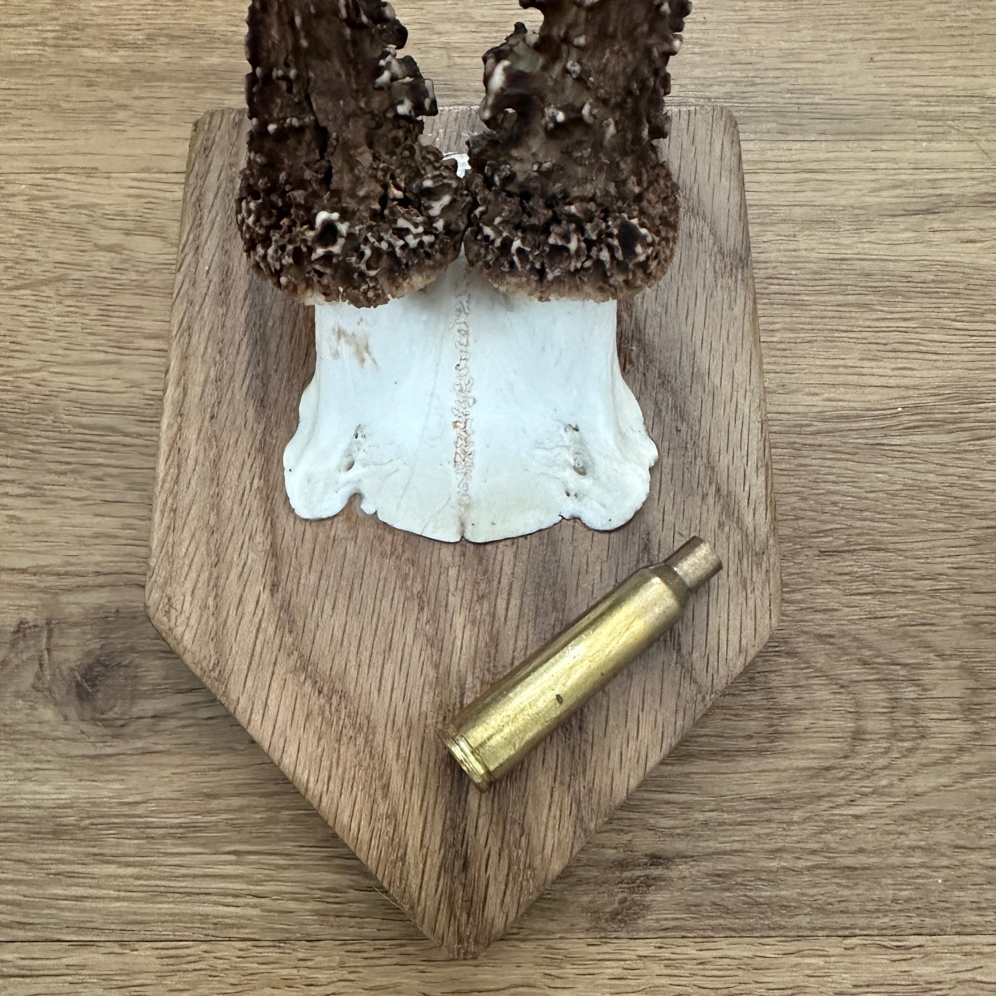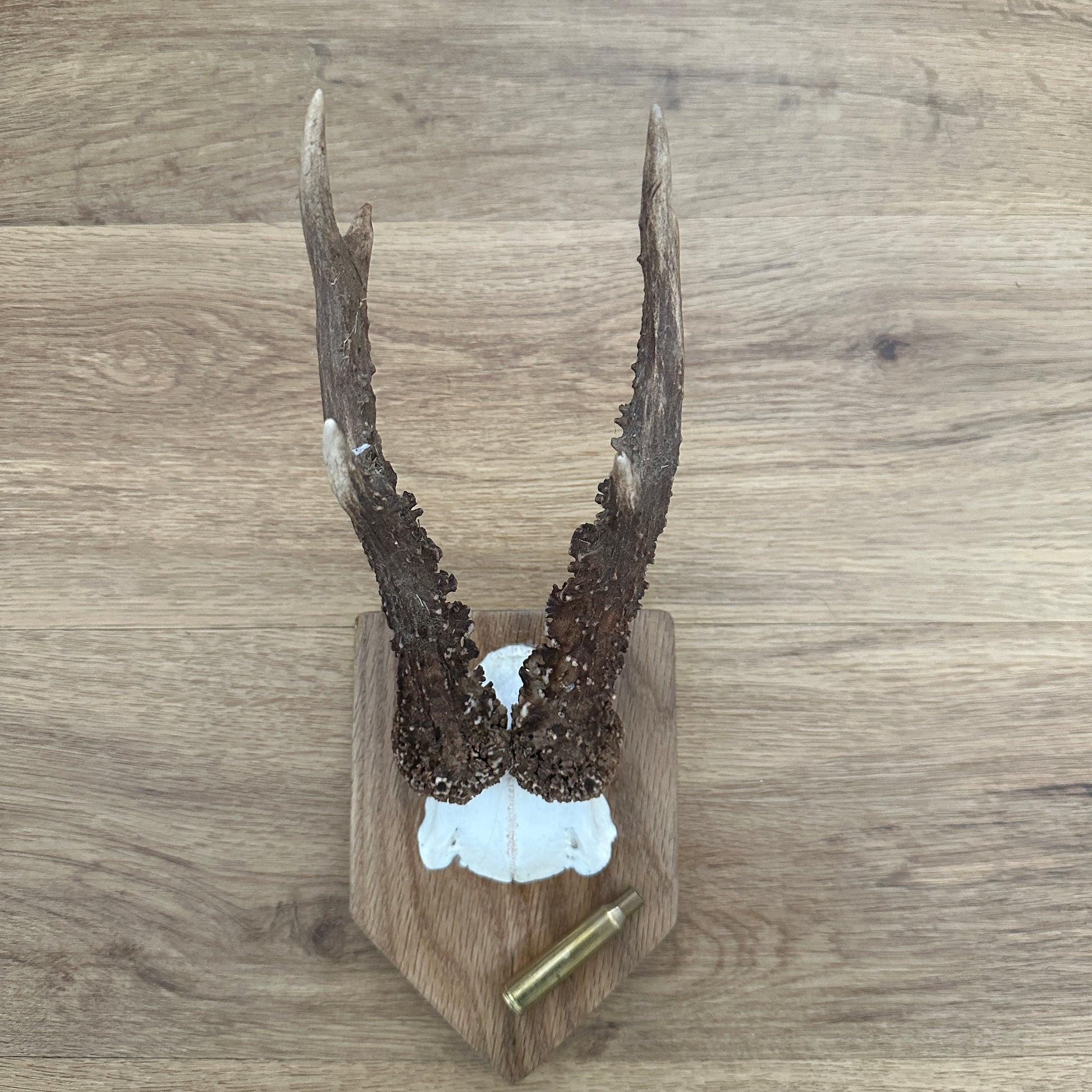 This Medium 6 Point Sussex Roe Deer Antler is mounted on a oak plaque with a felt backing and features a 6.5 x 55 brass case. It showcases natural variations in size and shape typical of Roe Deer antlers. Ideal for collectors or as a decorative piece in any setting.