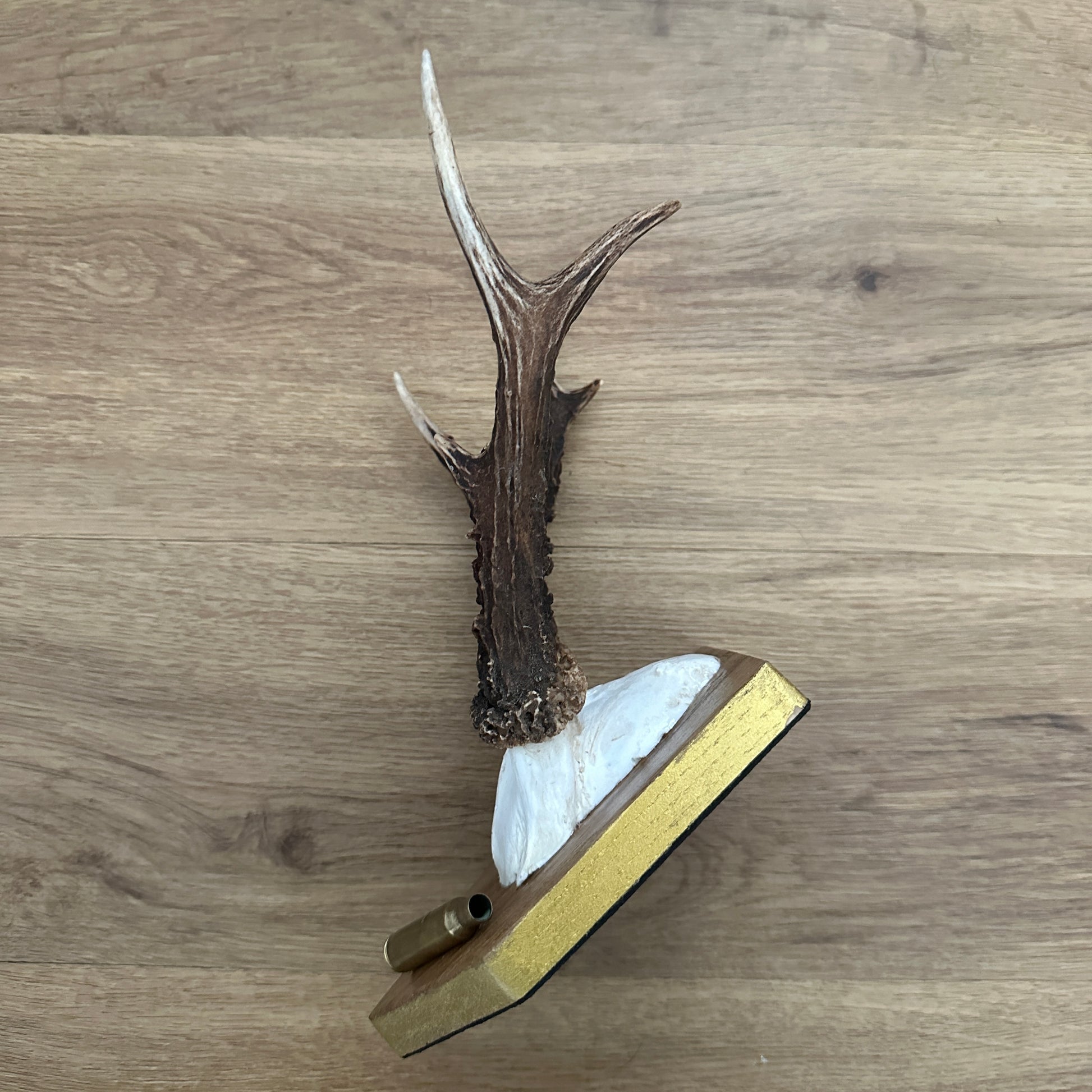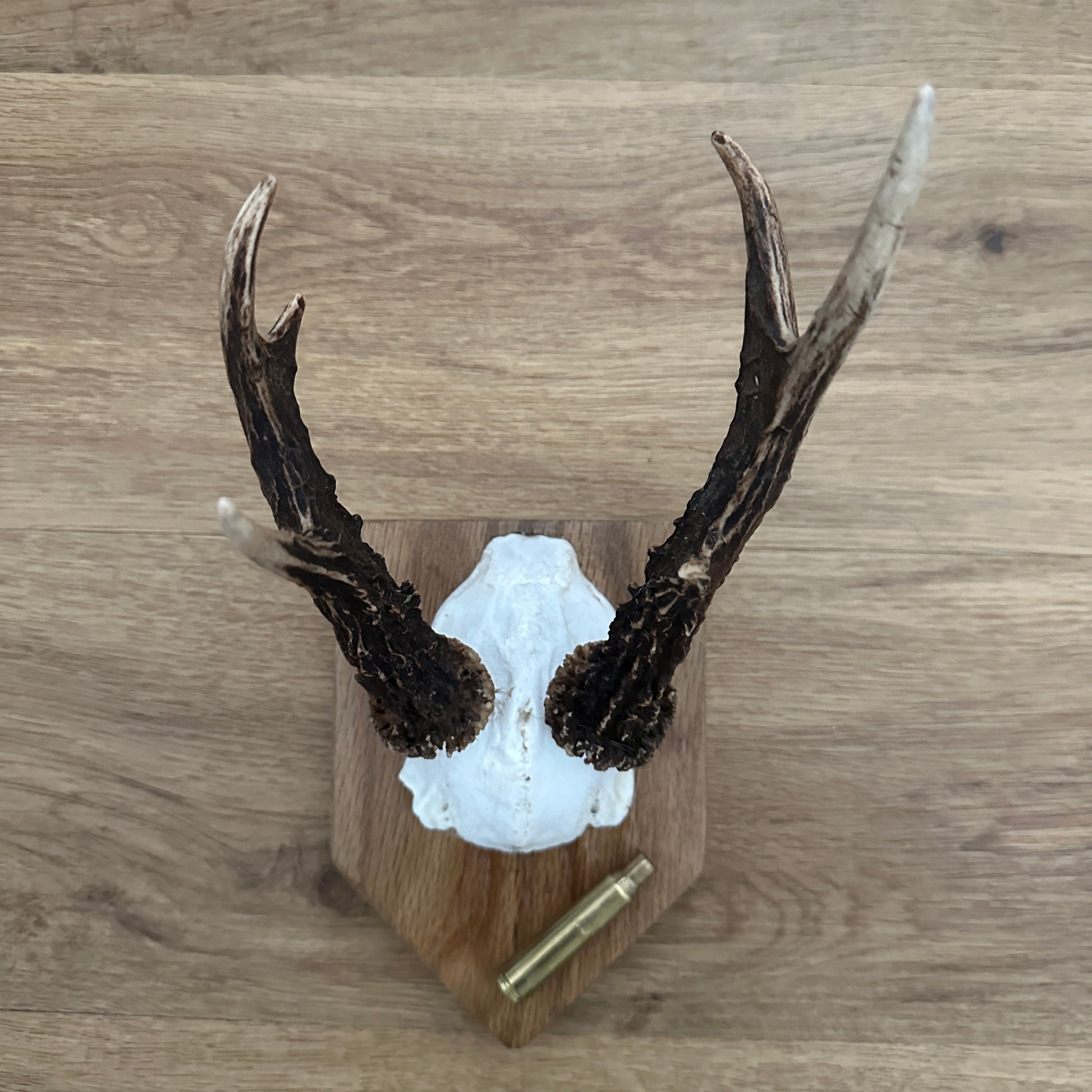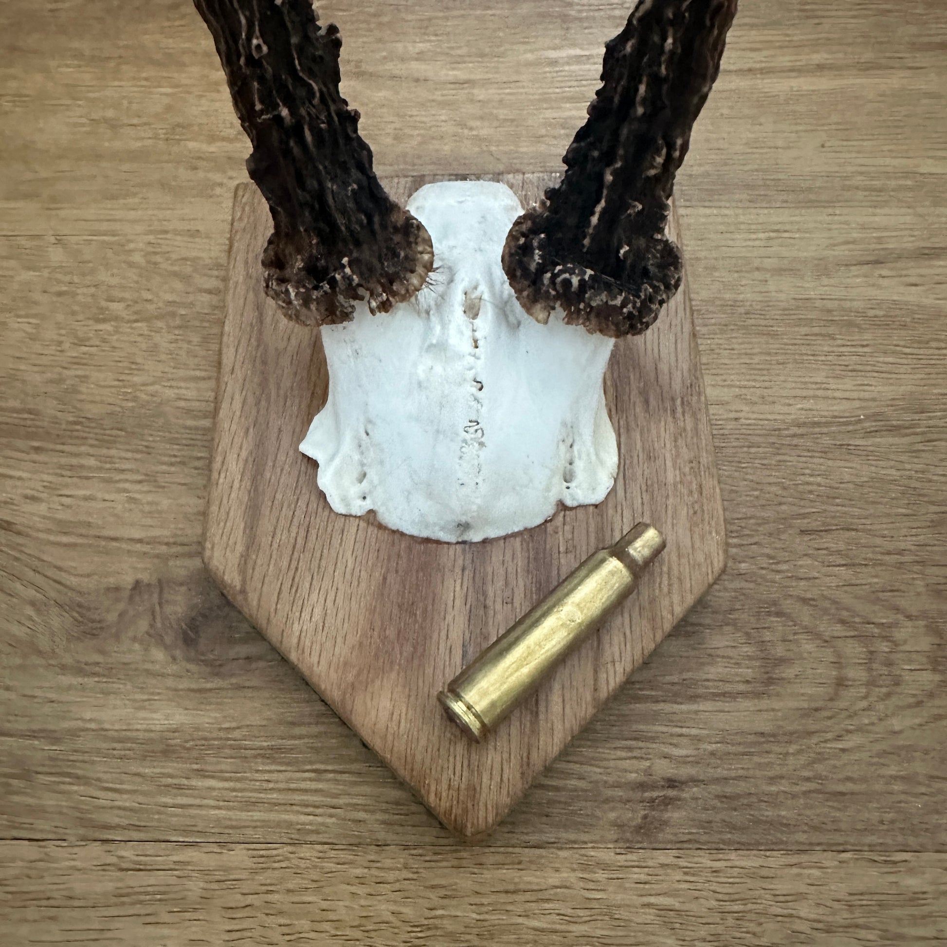 This Medium 6 Point Sussex Roe Deer Antler is mounted on a oak plaque with a felt backing and features a 6.5 x 55 brass case. It showcases natural variations in size and shape typical of Roe Deer antlers. Ideal for collectors or as a decorative piece in any setting.