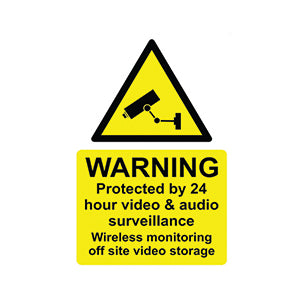Warning protected by 24 hour video and audio surveillance wireless monitoring off site video storage sign